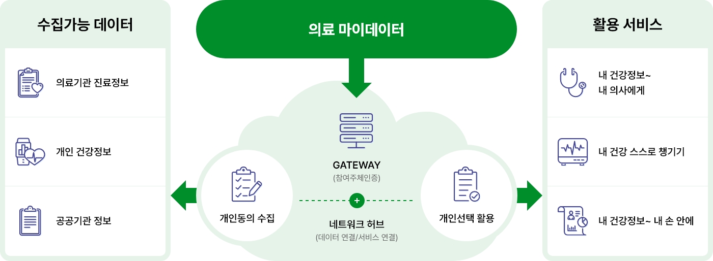 개인의 건강정보, 의료기관에서 진료받은 정보, 관련 공공기관에서 제공한 정보들을 '의료 마이데이터'라는 플랫폼에 수집하고 저장해요.